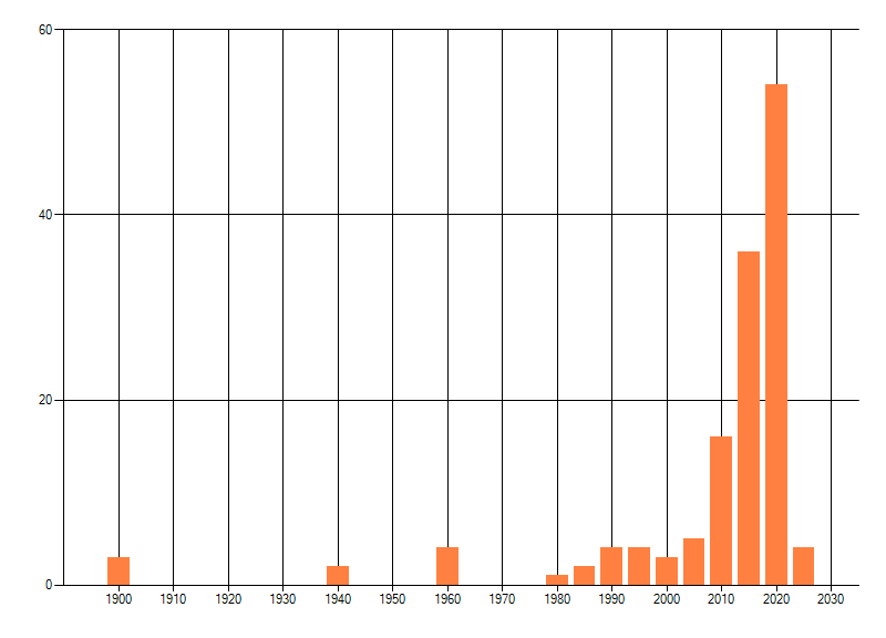 Het aantal atlasblokken (5x5 km) waarin de soort is gemeld binnen een periode van vijf jaar (vanaf 1980) of twintig jaar. Niet gecorrigeerd voor waarnemersinspanning en het aantal doorgegeven waarnemingen kan sterk variëren per periode, dus een trend in verspreiding kan hier niet direct uit worden afgelezen. Het opgegeven jaartal is het eerste jaar van de periode. Bron: gevalideerde waarnemingen uit de NDFF.