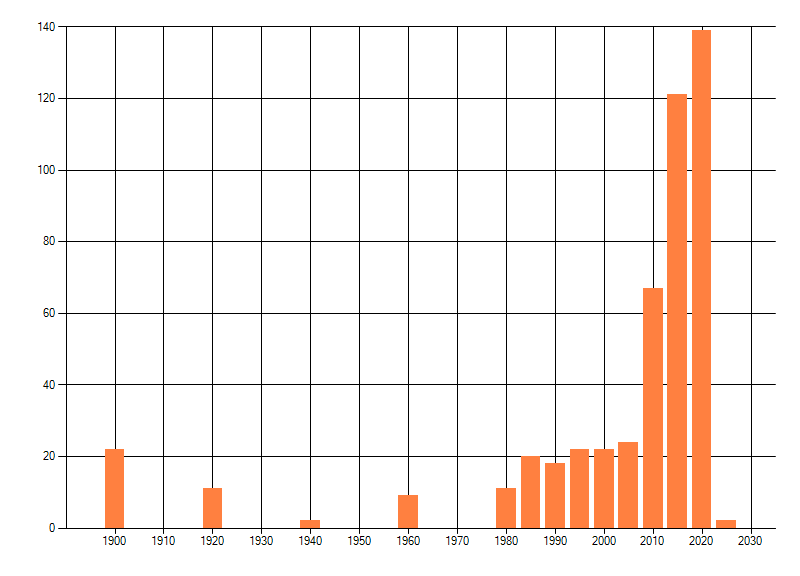 Het aantal atlasblokken (5x5 km) waarin de soort is gemeld binnen een periode van vijf jaar (vanaf 1980) of twintig jaar. Niet gecorrigeerd voor waarnemersinspanning en het aantal doorgegeven waarnemingen kan sterk variëren per periode, dus een trend in verspreiding kan hier niet direct uit worden afgelezen. Het opgegeven jaartal is het eerste jaar van de periode. Bron: gevalideerde waarnemingen uit de NDFF.