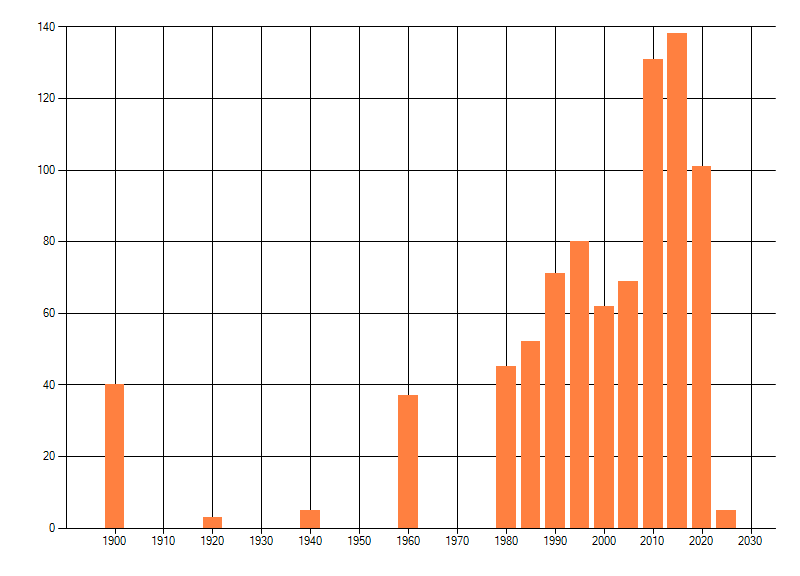 Het aantal atlasblokken (5x5 km) waarin de soort is gemeld binnen een periode van vijf jaar (vanaf 1980) of twintig jaar. Niet gecorrigeerd voor waarnemersinspanning en het aantal doorgegeven waarnemingen kan sterk variëren per periode, dus een trend in verspreiding kan hier niet direct uit worden afgelezen. Het opgegeven jaartal is het eerste jaar van de periode. Bron: gevalideerde waarnemingen uit de NDFF.