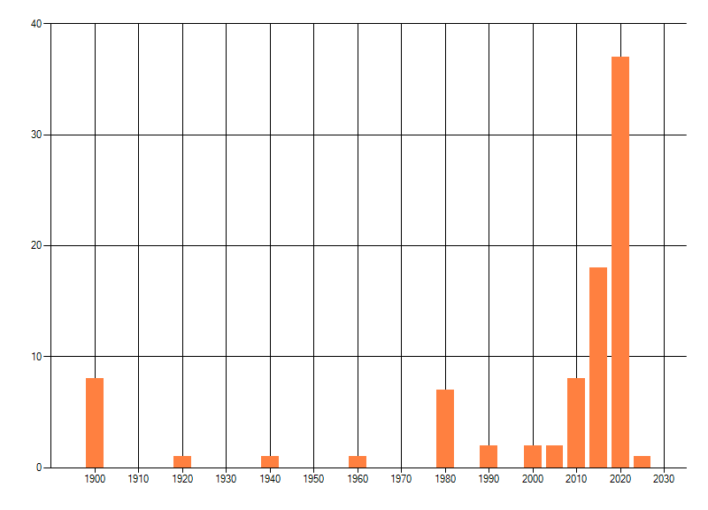 Het aantal atlasblokken (5x5 km) waarin de soort is gemeld binnen een periode van vijf jaar (vanaf 1980) of twintig jaar. Niet gecorrigeerd voor waarnemersinspanning en het aantal doorgegeven waarnemingen kan sterk variëren per periode, dus een trend in verspreiding kan hier niet direct uit worden afgelezen. Het opgegeven jaartal is het eerste jaar van de periode. Bron: gevalideerde waarnemingen uit de NDFF.