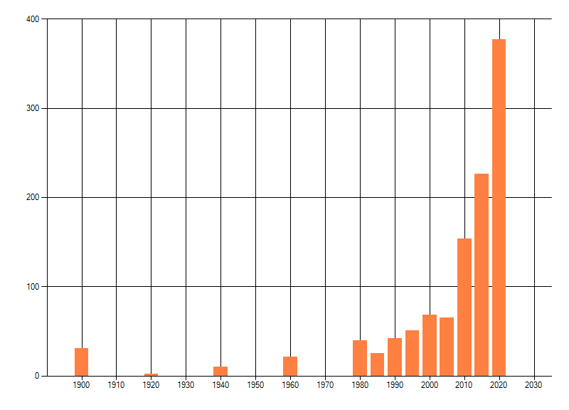 Het aantal atlasblokken (5x5 km) waarin de soort is gemeld binnen een periode van vijf jaar (vanaf 1980) of twintig jaar. Niet gecorrigeerd voor waarnemersinspanning en het aantal doorgegeven waarnemingen kan sterk variëren per periode, dus een trend in verspreiding kan hier niet direct uit worden afgelezen. Het opgegeven jaartal is het eerste jaar van de periode. Bron: gevalideerde waarnemingen uit de NDFF.