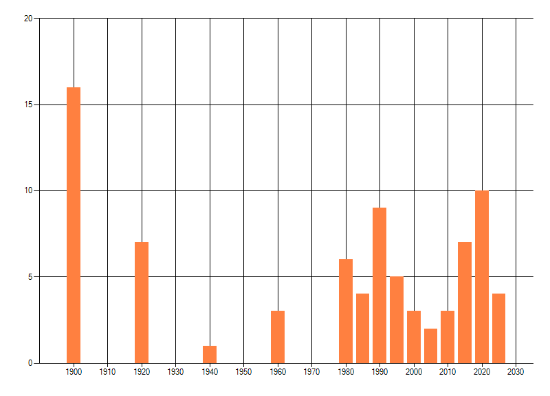 Het aantal atlasblokken (5x5 km) waarin de soort is gemeld binnen een periode van vijf jaar (vanaf 1980) of twintig jaar. Niet gecorrigeerd voor waarnemersinspanning en het aantal doorgegeven waarnemingen kan sterk variëren per periode, dus een trend in verspreiding kan hier niet direct uit worden afgelezen. Het opgegeven jaartal is het eerste jaar van de periode. Bron: gevalideerde waarnemingen uit de NDFF.
