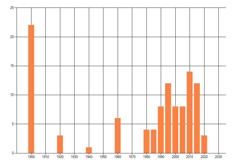 Het aantal atlasblokken (5x5 km) waarin de soort is gemeld binnen een periode van vijf jaar (vanaf 1980) of twintig jaar. Niet gecorrigeerd voor waarnemersinspanning en het aantal doorgegeven waarnemingen kan sterk variëren per periode, dus een trend in verspreiding kan hier niet direct uit worden afgelezen. Het opgegeven jaartal is het eerste jaar van de periode. Bron: gevalideerde waarnemingen uit de NDFF.