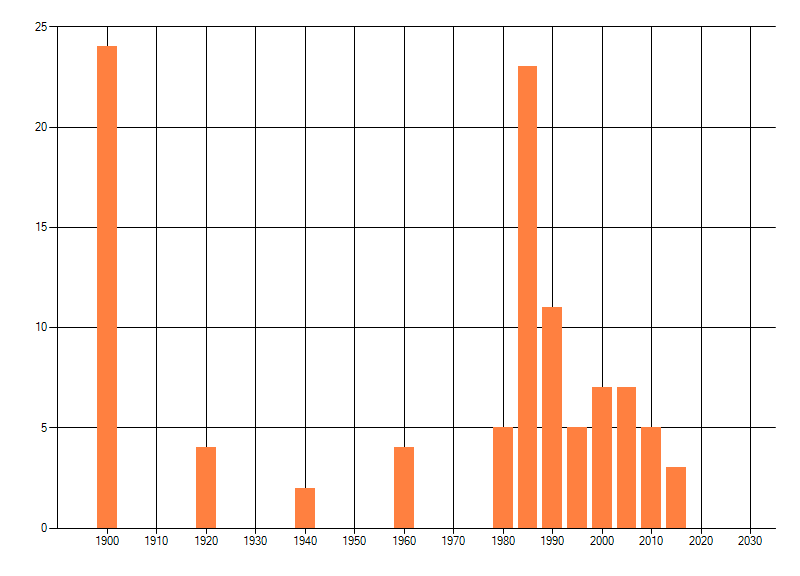 Het aantal atlasblokken (5x5 km) waarin de soort is gemeld binnen een periode van vijf jaar (vanaf 1980) of twintig jaar. Niet gecorrigeerd voor waarnemersinspanning en het aantal doorgegeven waarnemingen kan sterk variëren per periode, dus een trend in verspreiding kan hier niet direct uit worden afgelezen. Het opgegeven jaartal is het eerste jaar van de periode. Bron: gevalideerde waarnemingen uit de NDFF.