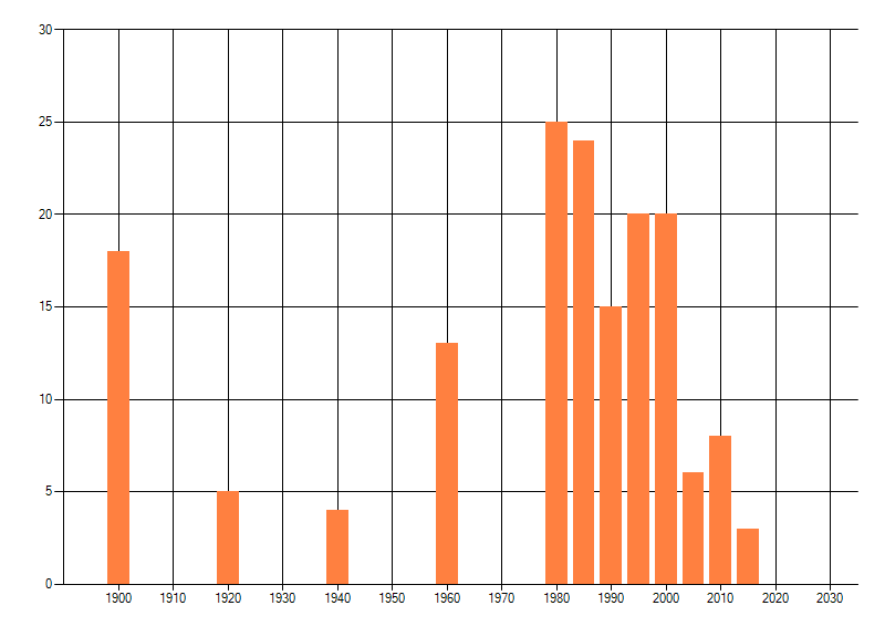 Het aantal atlasblokken (5x5 km) waarin de soort is gemeld binnen een periode van vijf jaar (vanaf 1980) of twintig jaar. Niet gecorrigeerd voor waarnemersinspanning en het aantal doorgegeven waarnemingen kan sterk variëren per periode, dus een trend in verspreiding kan hier niet direct uit worden afgelezen. Het opgegeven jaartal is het eerste jaar van de periode. Bron: gevalideerde waarnemingen uit de NDFF.