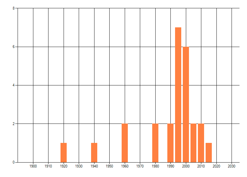 Het aantal atlasblokken (5x5 km) waarin de soort is gemeld binnen een periode van vijf jaar (vanaf 1980) of twintig jaar. Niet gecorrigeerd voor waarnemersinspanning en het aantal doorgegeven waarnemingen kan sterk variëren per periode, dus een trend in verspreiding kan hier niet direct uit worden afgelezen. Het opgegeven jaartal is het eerste jaar van de periode. Bron: gevalideerde waarnemingen uit de NDFF.