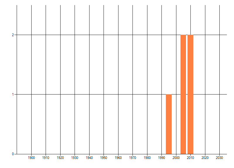 Het aantal atlasblokken (5x5 km) waarin de soort is gemeld binnen een periode van vijf jaar (vanaf 1980) of twintig jaar. Niet gecorrigeerd voor waarnemersinspanning en het aantal doorgegeven waarnemingen kan sterk variëren per periode, dus een trend in verspreiding kan hier niet direct uit worden afgelezen. Het opgegeven jaartal is het eerste jaar van de periode. Bron: gevalideerde waarnemingen uit de NDFF.
