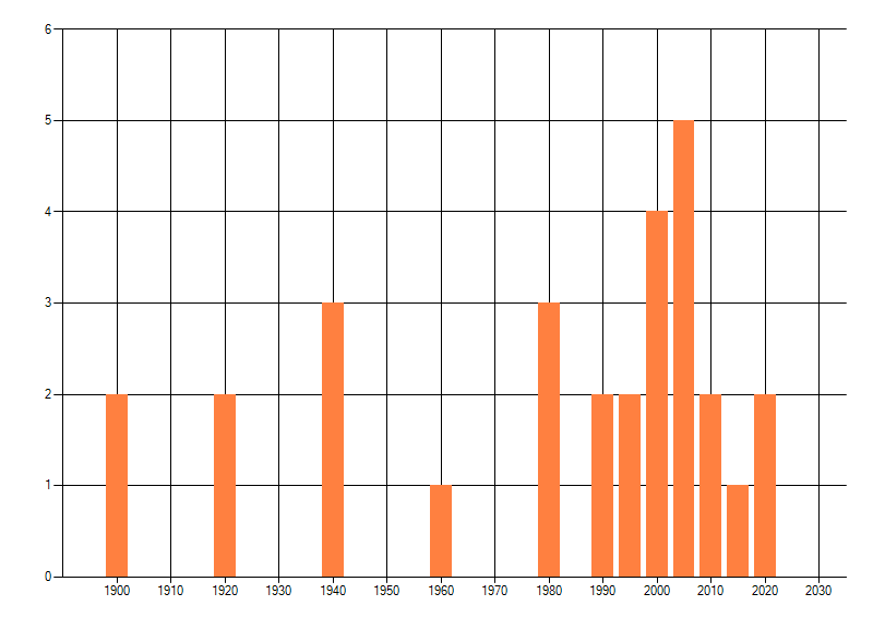 Het aantal atlasblokken (5x5 km) waarin de soort is gemeld binnen een periode van vijf jaar (vanaf 1980) of twintig jaar. Niet gecorrigeerd voor waarnemersinspanning en het aantal doorgegeven waarnemingen kan sterk variëren per periode, dus een trend in verspreiding kan hier niet direct uit worden afgelezen. Het opgegeven jaartal is het eerste jaar van de periode. Bron: gevalideerde waarnemingen uit de NDFF.