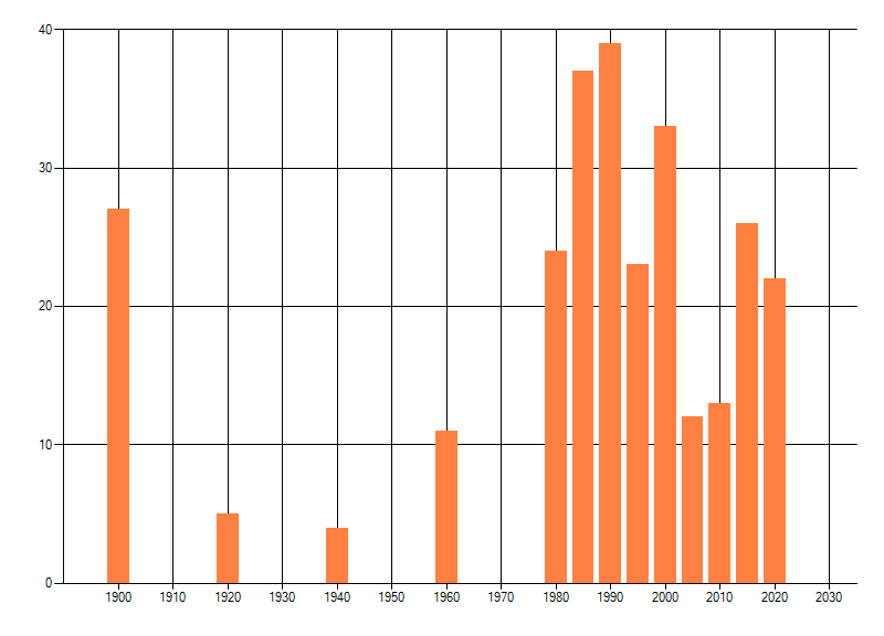 Het aantal atlasblokken (5x5 km) waarin de soort is gemeld binnen een periode van vijf jaar (vanaf 1980) of twintig jaar. Niet gecorrigeerd voor waarnemersinspanning en het aantal doorgegeven waarnemingen kan sterk variëren per periode, dus een trend in verspreiding kan hier niet direct uit worden afgelezen. Het opgegeven jaartal is het eerste jaar van de periode. Bron: gevalideerde waarnemingen uit de NDFF.
