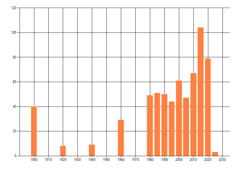 Het aantal atlasblokken (5x5 km) waarin de soort is gemeld binnen een periode van vijf jaar (vanaf 1980) of twintig jaar. Niet gecorrigeerd voor waarnemersinspanning en het aantal doorgegeven waarnemingen kan sterk variëren per periode, dus een trend in verspreiding kan hier niet direct uit worden afgelezen. Het opgegeven jaartal is het eerste jaar van de periode. Bron: gevalideerde waarnemingen uit de NDFF.
