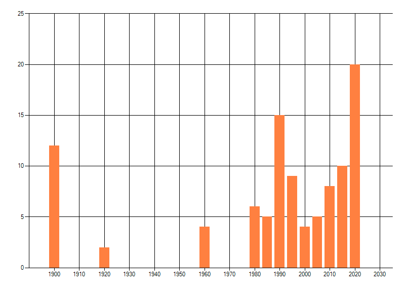 Het aantal atlasblokken (5x5 km) waarin de soort is gemeld binnen een periode van vijf jaar (vanaf 1980) of twintig jaar. Niet gecorrigeerd voor waarnemersinspanning en het aantal doorgegeven waarnemingen kan sterk variëren per periode, dus een trend in verspreiding kan hier niet direct uit worden afgelezen. Het opgegeven jaartal is het eerste jaar van de periode. Bron: gevalideerde waarnemingen uit de NDFF.