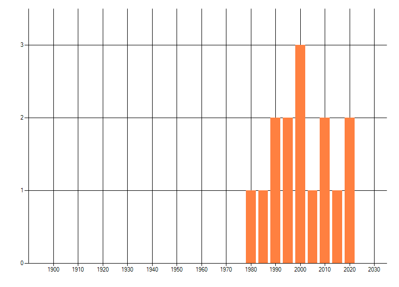 Het aantal atlasblokken (5x5 km) waarin de soort is gemeld binnen een periode van vijf jaar (vanaf 1980) of twintig jaar. Niet gecorrigeerd voor waarnemersinspanning en het aantal doorgegeven waarnemingen kan sterk variëren per periode, dus een trend in verspreiding kan hier niet direct uit worden afgelezen. Het opgegeven jaartal is het eerste jaar van de periode. Bron: gevalideerde waarnemingen uit de NDFF.