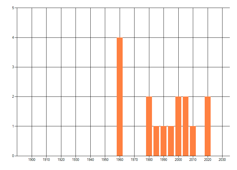 Het aantal atlasblokken (5x5 km) waarin de soort is gemeld binnen een periode van vijf jaar (vanaf 1980) of twintig jaar. Niet gecorrigeerd voor waarnemersinspanning en het aantal doorgegeven waarnemingen kan sterk variëren per periode, dus een trend in verspreiding kan hier niet direct uit worden afgelezen. Het opgegeven jaartal is het eerste jaar van de periode. Bron: gevalideerde waarnemingen uit de NDFF.