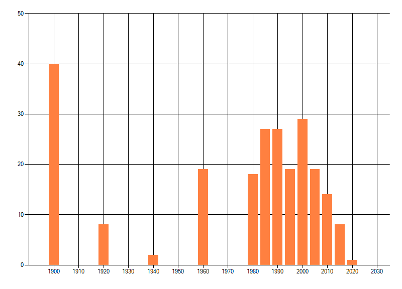Het aantal atlasblokken (5x5 km) waarin de soort is gemeld binnen een periode van vijf jaar (vanaf 1980) of twintig jaar. Niet gecorrigeerd voor waarnemersinspanning en het aantal doorgegeven waarnemingen kan sterk variëren per periode, dus een trend in verspreiding kan hier niet direct uit worden afgelezen. Het opgegeven jaartal is het eerste jaar van de periode. Bron: gevalideerde waarnemingen uit de NDFF.