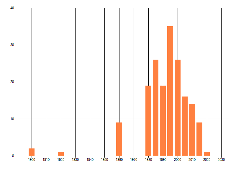 Het aantal atlasblokken (5x5 km) waarin de soort is gemeld binnen een periode van vijf jaar (vanaf 1980) of twintig jaar. Niet gecorrigeerd voor waarnemersinspanning en het aantal doorgegeven waarnemingen kan sterk variëren per periode, dus een trend in verspreiding kan hier niet direct uit worden afgelezen. Het opgegeven jaartal is het eerste jaar van de periode. Bron: gevalideerde waarnemingen uit de NDFF.