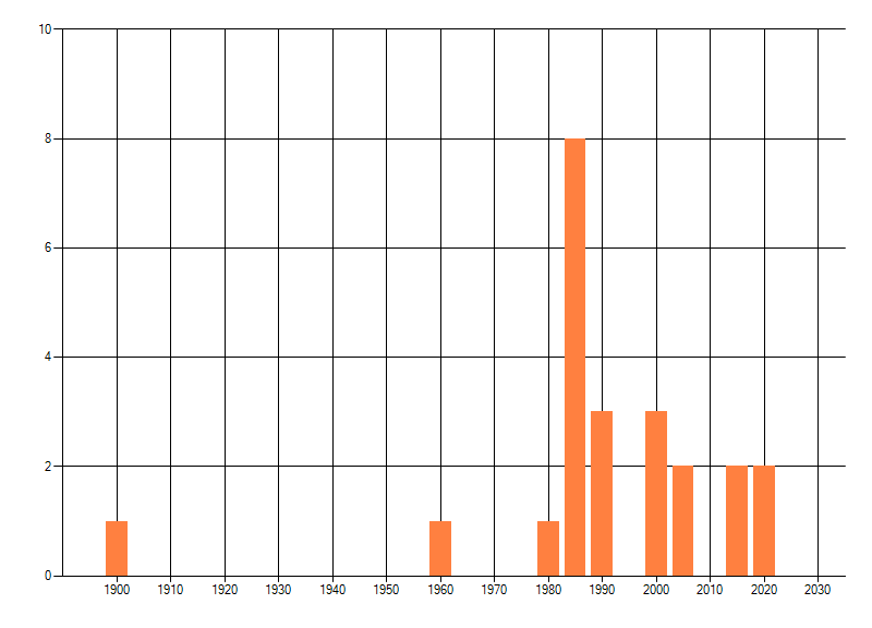 Het aantal atlasblokken (5x5 km) waarin de soort is gemeld binnen een periode van vijf jaar (vanaf 1980) of twintig jaar. Niet gecorrigeerd voor waarnemersinspanning en het aantal doorgegeven waarnemingen kan sterk variëren per periode, dus een trend in verspreiding kan hier niet direct uit worden afgelezen. Het opgegeven jaartal is het eerste jaar van de periode. Bron: gevalideerde waarnemingen uit de NDFF.