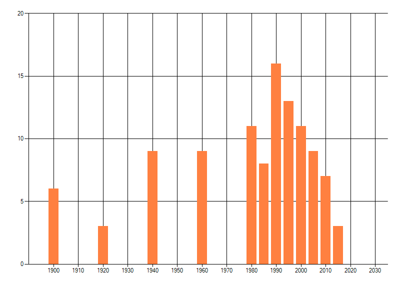 Het aantal atlasblokken (5x5 km) waarin de soort is gemeld binnen een periode van vijf jaar (vanaf 1980) of twintig jaar. Niet gecorrigeerd voor waarnemersinspanning en het aantal doorgegeven waarnemingen kan sterk variëren per periode, dus een trend in verspreiding kan hier niet direct uit worden afgelezen. Het opgegeven jaartal is het eerste jaar van de periode. Bron: gevalideerde waarnemingen uit de NDFF.