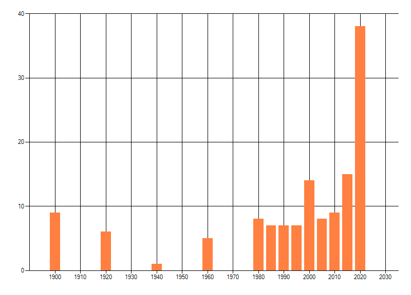 Het aantal atlasblokken (5x5 km) waarin de soort is gemeld binnen een periode van vijf jaar (vanaf 1980) of twintig jaar. Niet gecorrigeerd voor waarnemersinspanning en het aantal doorgegeven waarnemingen kan sterk variëren per periode, dus een trend in verspreiding kan hier niet direct uit worden afgelezen. Het opgegeven jaartal is het eerste jaar van de periode. Bron: gevalideerde waarnemingen uit de NDFF.