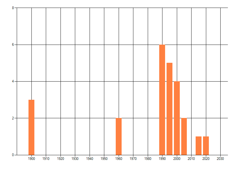 Het aantal atlasblokken (5x5 km) waarin de soort is gemeld binnen een periode van vijf jaar (vanaf 1980) of twintig jaar. Niet gecorrigeerd voor waarnemersinspanning en het aantal doorgegeven waarnemingen kan sterk variëren per periode, dus een trend in verspreiding kan hier niet direct uit worden afgelezen. Het opgegeven jaartal is het eerste jaar van de periode. Bron: gevalideerde waarnemingen uit de NDFF.
