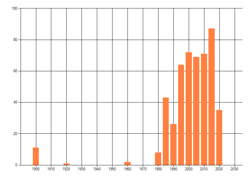 Het aantal atlasblokken (5x5 km) waarin de soort is gemeld binnen een periode van vijf jaar (vanaf 1980) of twintig jaar. Niet gecorrigeerd voor waarnemersinspanning en het aantal doorgegeven waarnemingen kan sterk variëren per periode, dus een trend in verspreiding kan hier niet direct uit worden afgelezen. Het opgegeven jaartal is het eerste jaar van de periode. Bron: gevalideerde waarnemingen uit de NDFF.