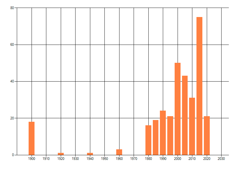 Het aantal atlasblokken (5x5 km) waarin de soort is gemeld binnen een periode van vijf jaar (vanaf 1980) of twintig jaar. Niet gecorrigeerd voor waarnemersinspanning en het aantal doorgegeven waarnemingen kan sterk variëren per periode, dus een trend in verspreiding kan hier niet direct uit worden afgelezen. Het opgegeven jaartal is het eerste jaar van de periode. Bron: gevalideerde waarnemingen uit de NDFF.