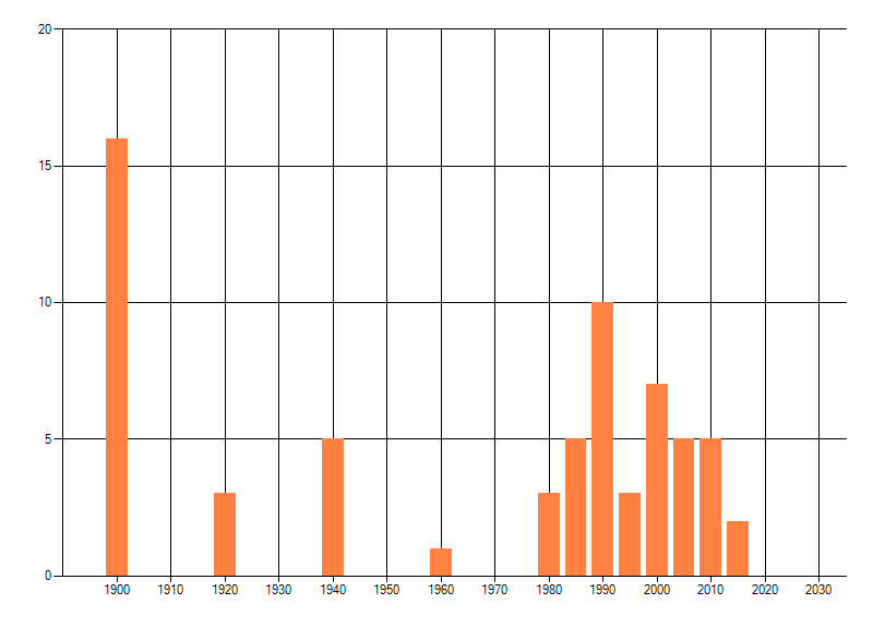 Het aantal atlasblokken (5x5 km) waarin de soort is gemeld binnen een periode van vijf jaar (vanaf 1980) of twintig jaar. Niet gecorrigeerd voor waarnemersinspanning en het aantal doorgegeven waarnemingen kan sterk variëren per periode, dus een trend in verspreiding kan hier niet direct uit worden afgelezen. Het opgegeven jaartal is het eerste jaar van de periode. Bron: gevalideerde waarnemingen uit de NDFF.