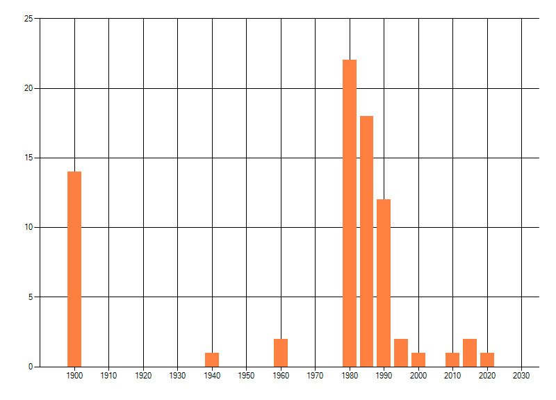 Het aantal atlasblokken (5x5 km) waarin de soort is gemeld binnen een periode van vijf jaar (vanaf 1980) of twintig jaar. Niet gecorrigeerd voor waarnemersinspanning en het aantal doorgegeven waarnemingen kan sterk variëren per periode, dus een trend in verspreiding kan hier niet direct uit worden afgelezen. Het opgegeven jaartal is het eerste jaar van de periode. Bron: gevalideerde waarnemingen uit de NDFF.