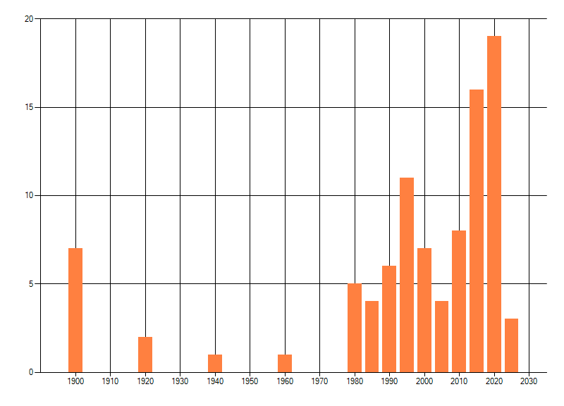 Het aantal atlasblokken (5x5 km) waarin de soort is gemeld binnen een periode van vijf jaar (vanaf 1980) of twintig jaar. Niet gecorrigeerd voor waarnemersinspanning en het aantal doorgegeven waarnemingen kan sterk variëren per periode, dus een trend in verspreiding kan hier niet direct uit worden afgelezen. Het opgegeven jaartal is het eerste jaar van de periode. Bron: gevalideerde waarnemingen uit de NDFF.