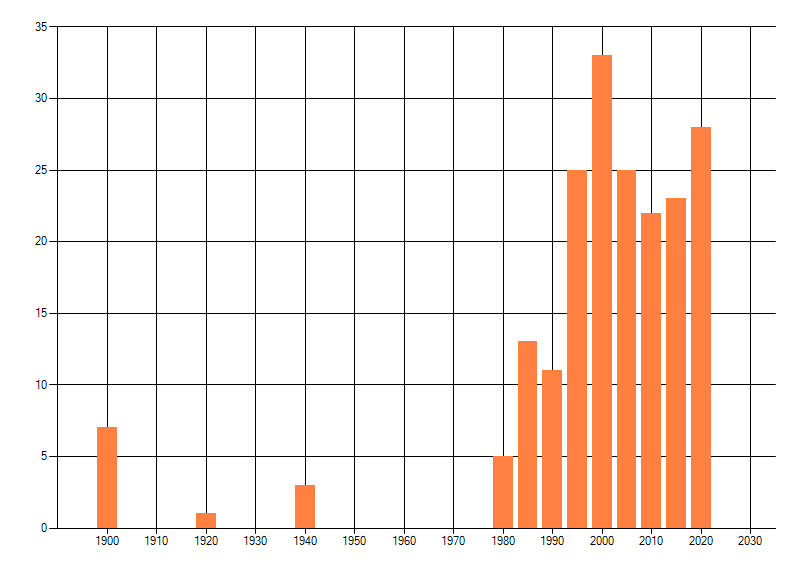 Het aantal atlasblokken (5x5 km) waarin de soort is gemeld binnen een periode van vijf jaar (vanaf 1980) of twintig jaar. Niet gecorrigeerd voor waarnemersinspanning en het aantal doorgegeven waarnemingen kan sterk variëren per periode, dus een trend in verspreiding kan hier niet direct uit worden afgelezen. Het opgegeven jaartal is het eerste jaar van de periode. Bron: gevalideerde waarnemingen uit de NDFF.