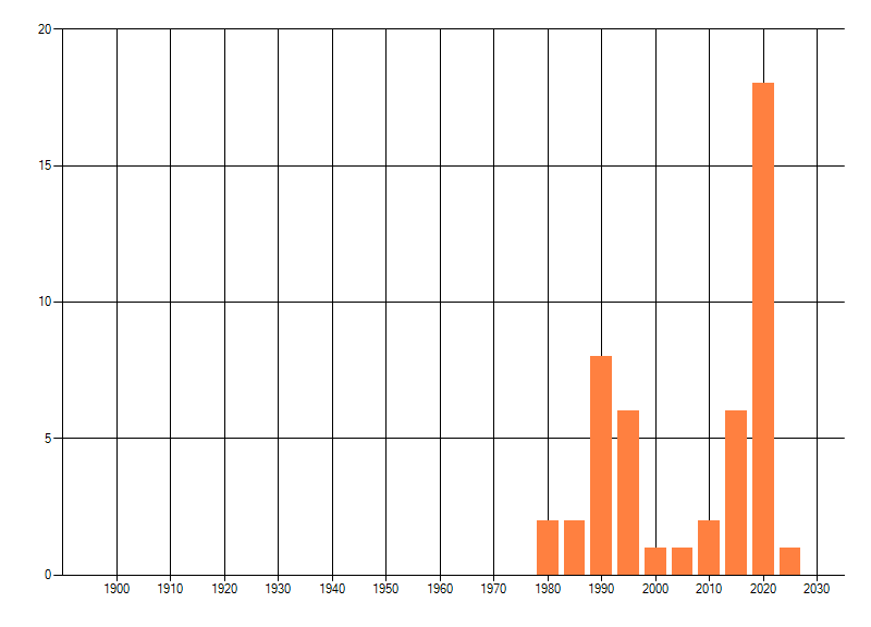 Het aantal atlasblokken (5x5 km) waarin de soort is gemeld binnen een periode van vijf jaar (vanaf 1980) of twintig jaar. Niet gecorrigeerd voor waarnemersinspanning en het aantal doorgegeven waarnemingen kan sterk variëren per periode, dus een trend in verspreiding kan hier niet direct uit worden afgelezen. Het opgegeven jaartal is het eerste jaar van de periode. Bron: gevalideerde waarnemingen uit de NDFF.