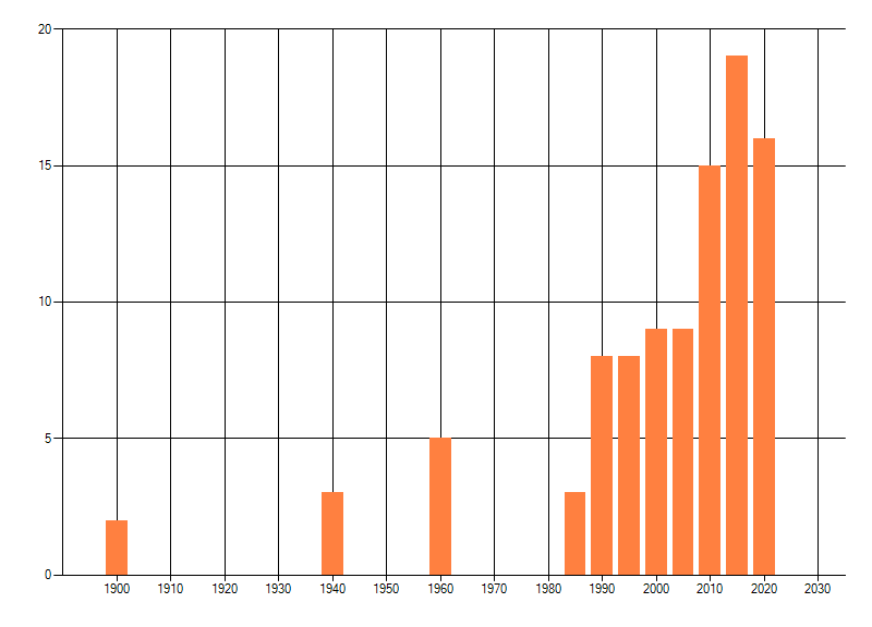 Het aantal atlasblokken (5x5 km) waarin de soort is gemeld binnen een periode van vijf jaar (vanaf 1980) of twintig jaar. Niet gecorrigeerd voor waarnemersinspanning en het aantal doorgegeven waarnemingen kan sterk variëren per periode, dus een trend in verspreiding kan hier niet direct uit worden afgelezen. Het opgegeven jaartal is het eerste jaar van de periode. Bron: gevalideerde waarnemingen uit de NDFF.