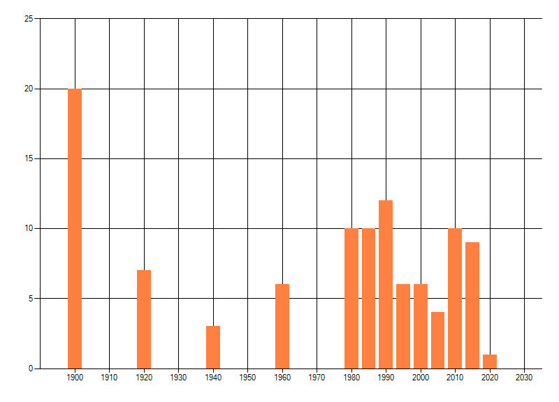 Het aantal atlasblokken (5x5 km) waarin de soort is gemeld binnen een periode van vijf jaar (vanaf 1980) of twintig jaar. Niet gecorrigeerd voor waarnemersinspanning en het aantal doorgegeven waarnemingen kan sterk variëren per periode, dus een trend in verspreiding kan hier niet direct uit worden afgelezen. Het opgegeven jaartal is het eerste jaar van de periode. Bron: gevalideerde waarnemingen uit de NDFF.