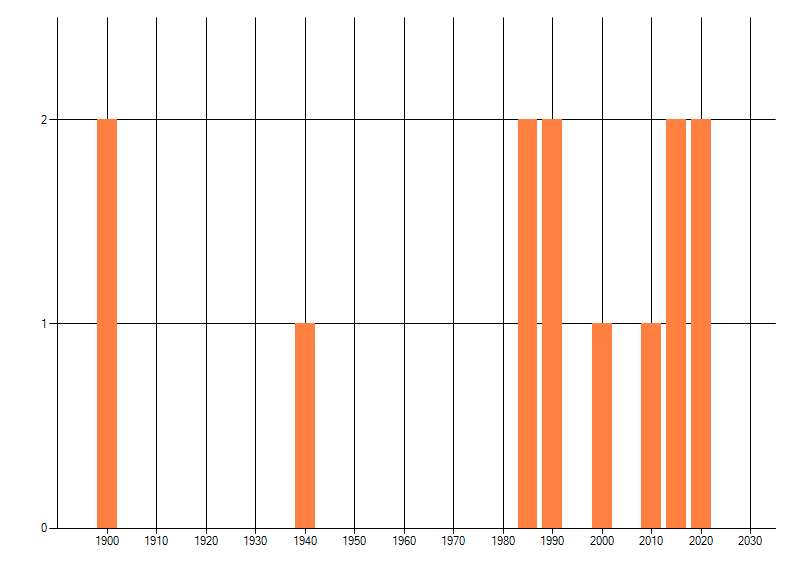Het aantal atlasblokken (5x5 km) waarin de soort is gemeld binnen een periode van vijf jaar (vanaf 1980) of twintig jaar. Niet gecorrigeerd voor waarnemersinspanning en het aantal doorgegeven waarnemingen kan sterk variëren per periode, dus een trend in verspreiding kan hier niet direct uit worden afgelezen. Het opgegeven jaartal is het eerste jaar van de periode. Bron: gevalideerde waarnemingen uit de NDFF.
