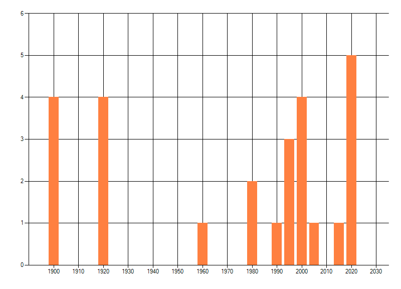 Het aantal atlasblokken (5x5 km) waarin de soort is gemeld binnen een periode van vijf jaar (vanaf 1980) of twintig jaar. Niet gecorrigeerd voor waarnemersinspanning en het aantal doorgegeven waarnemingen kan sterk variëren per periode, dus een trend in verspreiding kan hier niet direct uit worden afgelezen. Het opgegeven jaartal is het eerste jaar van de periode. Bron: gevalideerde waarnemingen uit de NDFF.