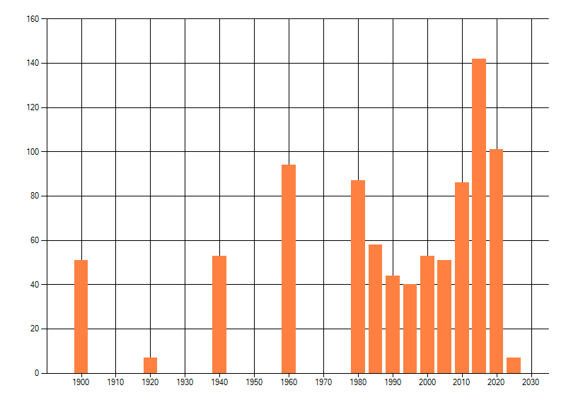 Het aantal atlasblokken (5x5 km) waarin de soort is gemeld binnen een periode van vijf jaar (vanaf 1980) of twintig jaar. Niet gecorrigeerd voor waarnemersinspanning en het aantal doorgegeven waarnemingen kan sterk variëren per periode, dus een trend in verspreiding kan hier niet direct uit worden afgelezen. Het opgegeven jaartal is het eerste jaar van de periode. Bron: gevalideerde waarnemingen uit de NDFF.