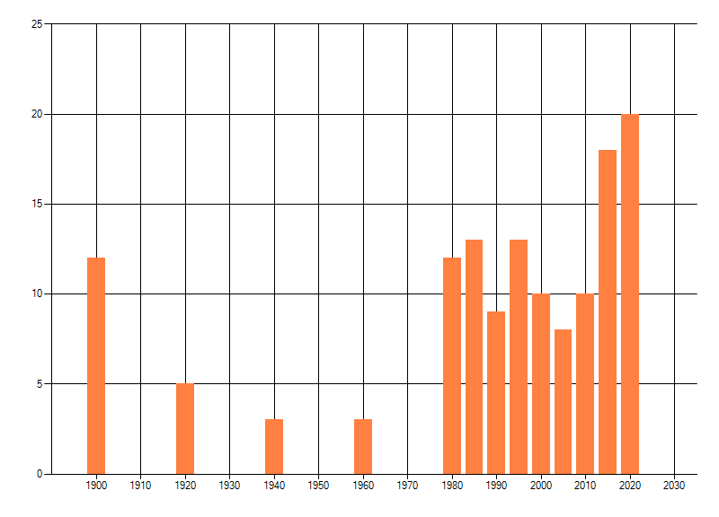 Het aantal atlasblokken (5x5 km) waarin de soort is gemeld binnen een periode van vijf jaar (vanaf 1980) of twintig jaar. Niet gecorrigeerd voor waarnemersinspanning en het aantal doorgegeven waarnemingen kan sterk variëren per periode, dus een trend in verspreiding kan hier niet direct uit worden afgelezen. Het opgegeven jaartal is het eerste jaar van de periode. Bron: gevalideerde waarnemingen uit de NDFF.