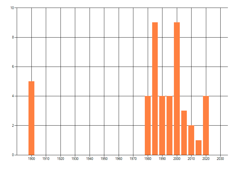 Het aantal atlasblokken (5x5 km) waarin de soort is gemeld binnen een periode van vijf jaar (vanaf 1980) of twintig jaar. Niet gecorrigeerd voor waarnemersinspanning en het aantal doorgegeven waarnemingen kan sterk variëren per periode, dus een trend in verspreiding kan hier niet direct uit worden afgelezen. Het opgegeven jaartal is het eerste jaar van de periode. Bron: gevalideerde waarnemingen uit de NDFF.