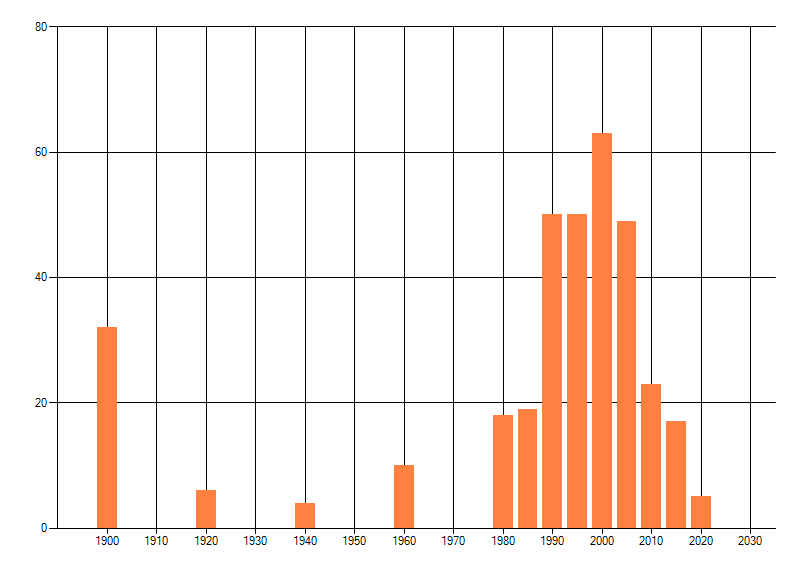 Het aantal atlasblokken (5x5 km) waarin de soort is gemeld binnen een periode van vijf jaar (vanaf 1980) of twintig jaar. Niet gecorrigeerd voor waarnemersinspanning en het aantal doorgegeven waarnemingen kan sterk variëren per periode, dus een trend in verspreiding kan hier niet direct uit worden afgelezen. Het opgegeven jaartal is het eerste jaar van de periode. Bron: gevalideerde waarnemingen uit de NDFF.