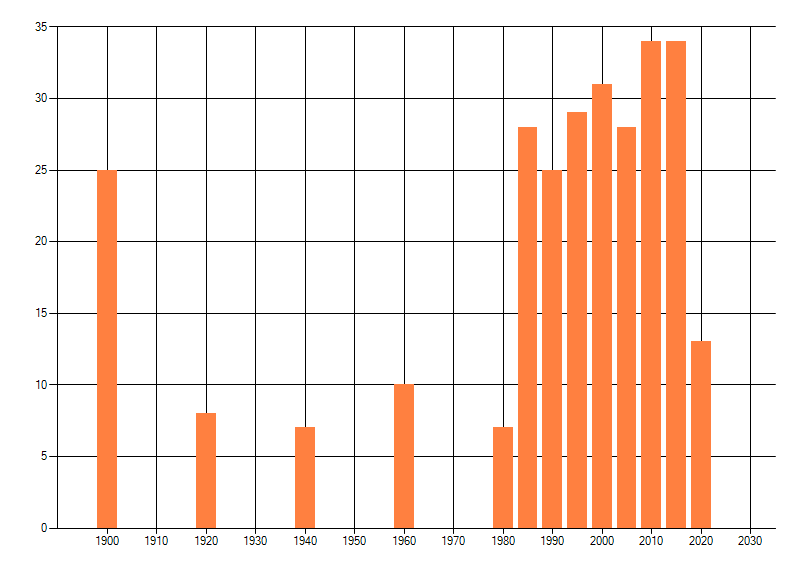 Het aantal atlasblokken (5x5 km) waarin de soort is gemeld binnen een periode van vijf jaar (vanaf 1980) of twintig jaar. Niet gecorrigeerd voor waarnemersinspanning en het aantal doorgegeven waarnemingen kan sterk variëren per periode, dus een trend in verspreiding kan hier niet direct uit worden afgelezen. Het opgegeven jaartal is het eerste jaar van de periode. Bron: gevalideerde waarnemingen uit de NDFF.