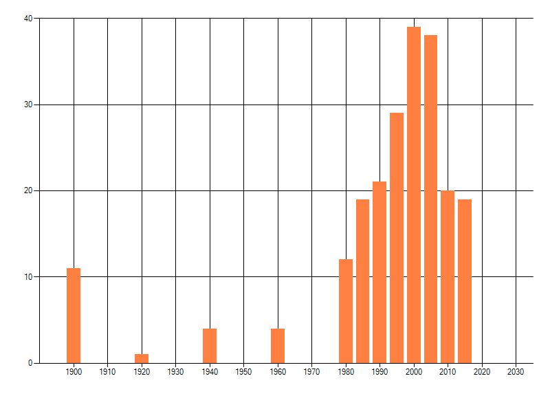 Het aantal atlasblokken (5x5 km) waarin de soort is gemeld binnen een periode van vijf jaar (vanaf 1980) of twintig jaar. Niet gecorrigeerd voor waarnemersinspanning en het aantal doorgegeven waarnemingen kan sterk variëren per periode, dus een trend in verspreiding kan hier niet direct uit worden afgelezen. Het opgegeven jaartal is het eerste jaar van de periode. Bron: gevalideerde waarnemingen uit de NDFF.