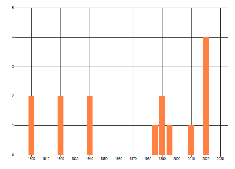 Het aantal atlasblokken (5x5 km) waarin de soort is gemeld binnen een periode van vijf jaar (vanaf 1980) of twintig jaar. Niet gecorrigeerd voor waarnemersinspanning en het aantal doorgegeven waarnemingen kan sterk variëren per periode, dus een trend in verspreiding kan hier niet direct uit worden afgelezen. Het opgegeven jaartal is het eerste jaar van de periode. Bron: gevalideerde waarnemingen uit de NDFF.