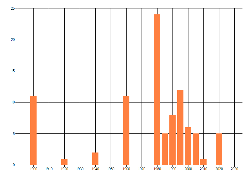 Het aantal atlasblokken (5x5 km) waarin de soort is gemeld binnen een periode van vijf jaar (vanaf 1980) of twintig jaar. Niet gecorrigeerd voor waarnemersinspanning en het aantal doorgegeven waarnemingen kan sterk variëren per periode, dus een trend in verspreiding kan hier niet direct uit worden afgelezen. Het opgegeven jaartal is het eerste jaar van de periode. Bron: gevalideerde waarnemingen uit de NDFF.