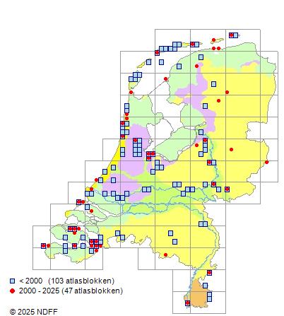Het aantal atlasblokken (5x5 km) waarin de soort is gemeld binnen een periode van vijf jaar (vanaf 1980) of twintig jaar. Niet gecorrigeerd voor waarnemersinspanning en het aantal doorgegeven waarnemingen kan sterk variëren per periode, dus een trend in verspreiding kan hier niet direct uit worden afgelezen. Het opgegeven jaartal is het eerste jaar van de periode. Bron: gevalideerde waarnemingen uit de NDFF.