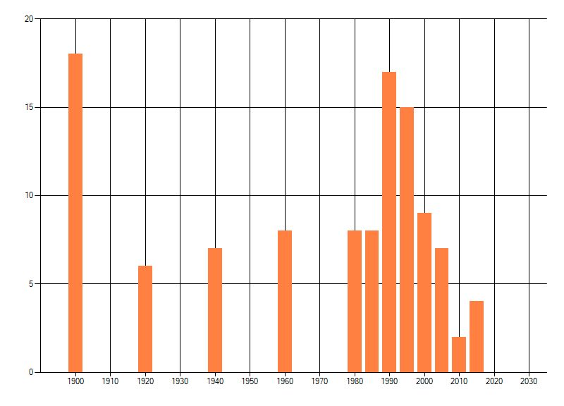 Het aantal atlasblokken (5x5 km) waarin de soort is gemeld binnen een periode van vijf jaar (vanaf 1980) of twintig jaar. Niet gecorrigeerd voor waarnemersinspanning en het aantal doorgegeven waarnemingen kan sterk variëren per periode, dus een trend in verspreiding kan hier niet direct uit worden afgelezen. Het opgegeven jaartal is het eerste jaar van de periode. Bron: gevalideerde waarnemingen uit de NDFF.
