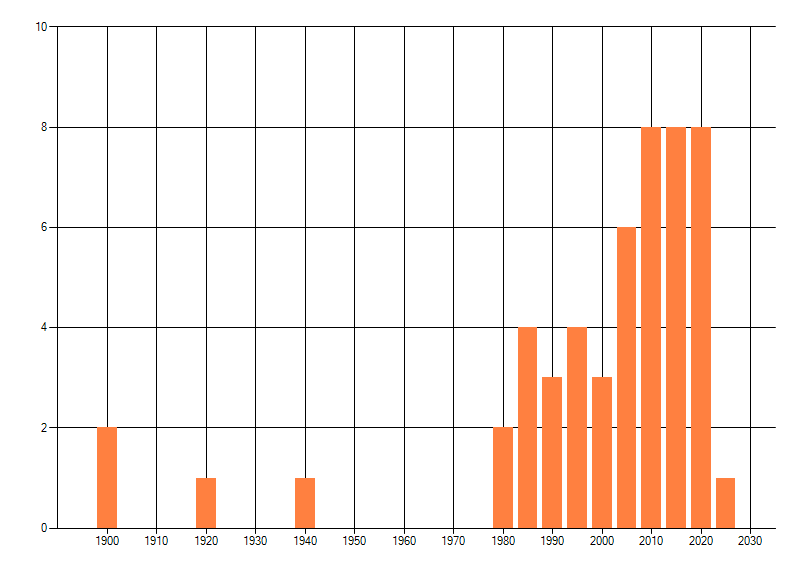 Het aantal atlasblokken (5x5 km) waarin de soort is gemeld binnen een periode van vijf jaar (vanaf 1980) of twintig jaar. Niet gecorrigeerd voor waarnemersinspanning en het aantal doorgegeven waarnemingen kan sterk variëren per periode, dus een trend in verspreiding kan hier niet direct uit worden afgelezen. Het opgegeven jaartal is het eerste jaar van de periode. Bron: gevalideerde waarnemingen uit de NDFF.