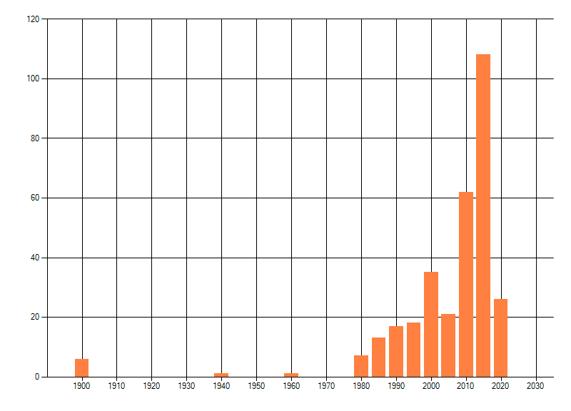 Het aantal atlasblokken (5x5 km) waarin de soort is gemeld binnen een periode van vijf jaar (vanaf 1980) of twintig jaar. Niet gecorrigeerd voor waarnemersinspanning en het aantal doorgegeven waarnemingen kan sterk variëren per periode, dus een trend in verspreiding kan hier niet direct uit worden afgelezen. Het opgegeven jaartal is het eerste jaar van de periode. Bron: gevalideerde waarnemingen uit de NDFF.