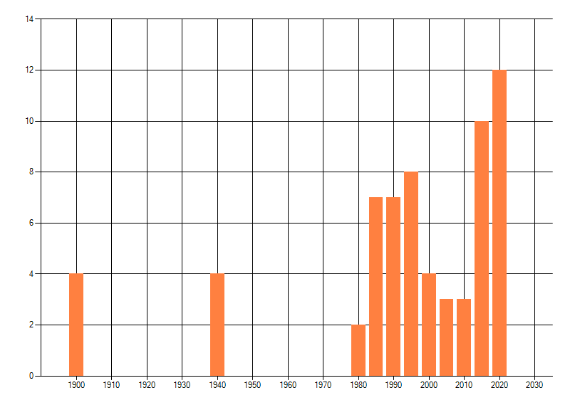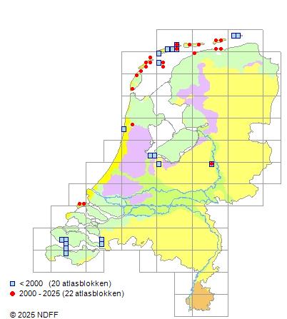 Het aantal atlasblokken (5x5 km) waarin de soort is gemeld binnen een periode van vijf jaar (vanaf 1980) of twintig jaar. Niet gecorrigeerd voor waarnemersinspanning en het aantal doorgegeven waarnemingen kan sterk variëren per periode, dus een trend in verspreiding kan hier niet direct uit worden afgelezen. Het opgegeven jaartal is het eerste jaar van de periode. Bron: gevalideerde waarnemingen uit de NDFF.