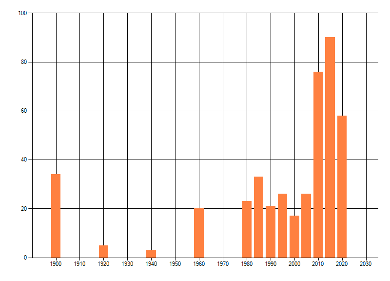 Het aantal atlasblokken (5x5 km) waarin de soort is gemeld binnen een periode van vijf jaar (vanaf 1980) of twintig jaar. Niet gecorrigeerd voor waarnemersinspanning en het aantal doorgegeven waarnemingen kan sterk variëren per periode, dus een trend in verspreiding kan hier niet direct uit worden afgelezen. Het opgegeven jaartal is het eerste jaar van de periode. Bron: gevalideerde waarnemingen uit de NDFF.