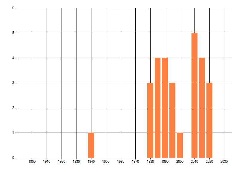Het aantal atlasblokken (5x5 km) waarin de soort is gemeld binnen een periode van vijf jaar (vanaf 1980) of twintig jaar. Niet gecorrigeerd voor waarnemersinspanning en het aantal doorgegeven waarnemingen kan sterk variëren per periode, dus een trend in verspreiding kan hier niet direct uit worden afgelezen. Het opgegeven jaartal is het eerste jaar van de periode. Bron: gevalideerde waarnemingen uit de NDFF.