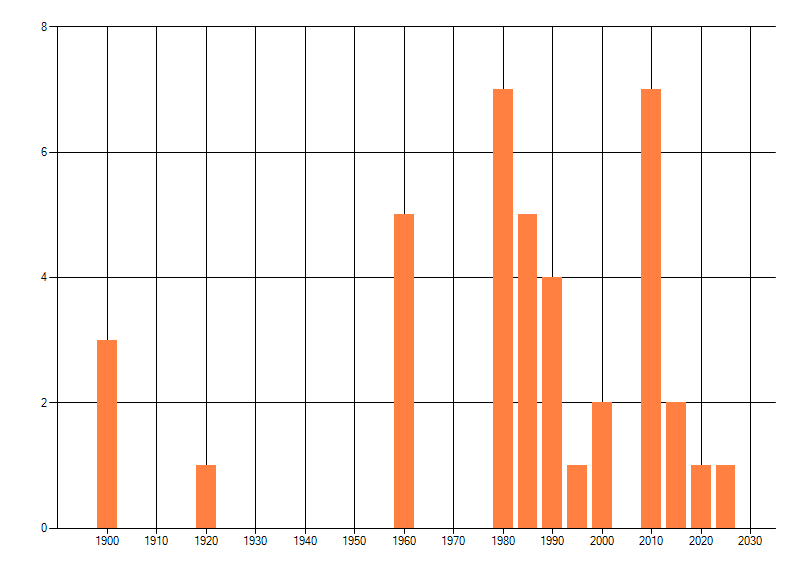 Het aantal atlasblokken (5x5 km) waarin de soort is gemeld binnen een periode van vijf jaar (vanaf 1980) of twintig jaar. Niet gecorrigeerd voor waarnemersinspanning en het aantal doorgegeven waarnemingen kan sterk variëren per periode, dus een trend in verspreiding kan hier niet direct uit worden afgelezen. Het opgegeven jaartal is het eerste jaar van de periode. Bron: gevalideerde waarnemingen uit de NDFF.